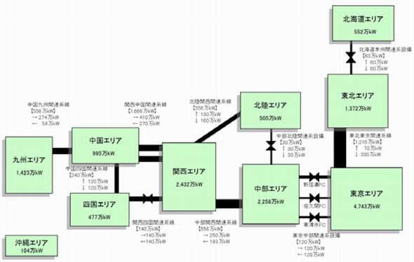 もう1つの問題は、北海道に電力を融通できる電力会社が東北電力しかないことだ。しかも最大で60万kWまでの電力に限られる(図3)。発電所の計画外停止が最大に達した場合には、東北から融通できる電力だけでは足りない可能性がある。同様に九州も中国電力からしか融通を受けられず、最大54万kWの供給力を増やすのが限界だ。