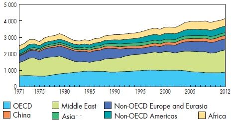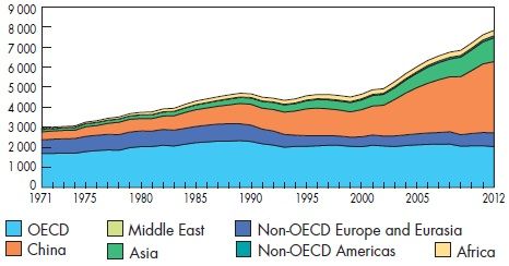 しかも全世界の生産量では、石炭が最近10年ほどのあいだに急増している一方、石油は微増の状態が続いている(図8、図9)。石炭は中国を筆頭に、インドやインドネシアなどアジア各国の生産量が拡大した。