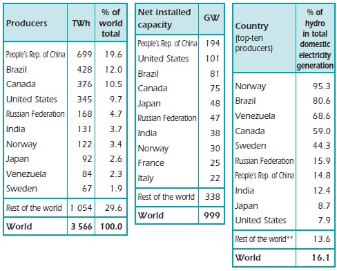 水力による発電量は全世界で比較しても原子力の規模を上回る。2011年の時点で水力が3.6兆kWhの電力を供給したのに対して、原子力は2.6兆kWhと7割程度の規模にとどまった。全電力に占める割合では水力が16%、原子力が12%になる。