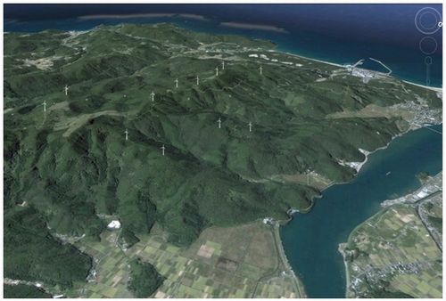 そのメガソーラーから南に5キロメートルほどの丘陵では、地元の企業を中心にした風力発電所の建設計画も進んでいる(図3)。1基で2.3MWの発電能力がある大型風車12基の合計で27.6MWを発揮する。すでに12基のうち一部は完成済みで、2014年10月に全基の運転を開始する予定だ。年間に供給できる電力は一般家庭で1万5000世帯分を想定している。