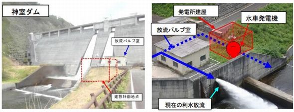 山形県の企業局が建設する「神室発電所」は、ダムの放流設備を拡張する方法で発電設備を導入する(図1)。既存の放流ルートを変更して、水車発電機に水を取り込み、発電後に下流へ放流する構造になる。