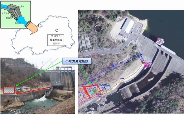 広島県が農業用水のために運営しているダムの1つに「三川(みかわ)ダム」がある(図3)。内陸部の世羅町(せらちょう)にあるダムで、下流へ放流する落差41メートルの水力を利用して発電する。500kWの発電能力で2015年4月に運転を開始する予定だ。年間の発電量は230万kWhを見込んでいて、640世帯分の電力を供給することができる。