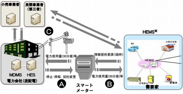 このデータを使って小売事業者は家庭の顧客に対して、使用量の見える化や節電アドバイスなどのサービスを提供することができる。公平な競争のためには、電力会社の小売部門も同じ仕組みで各家庭の情報を取得するように統一しなくてはならない。