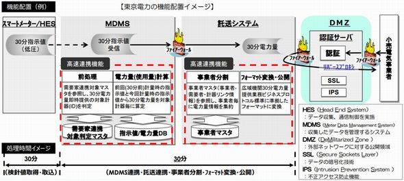 東京電力が想定しているシステムのイメージを見ると、スマートメーターから送られてくるデータを集計する「MDMS(メーターデータ管理システム)」に加えて、小売事業者と連携するための「託送システム」を構築する(図2)。さらにセキュリティを確保するために、小売事業者は認証サーバーを経由して、託送システム内の特定の領域(DMZ)にしかアクセスすることができない。