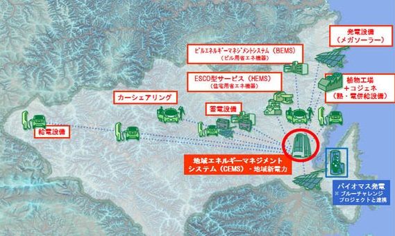 このメガソーラーの運転開始に合わせて、エネルギーの地産地消を実現するためのCEMS(地域エネルギー管理システム)も稼働させる計画だ(図3)。新電力と連携して再生可能エネルギーによる電力を地域内で供給する。同時に蓄電設備や給電設備を導入して、電力需要のピーク時や停電時に備える。