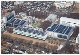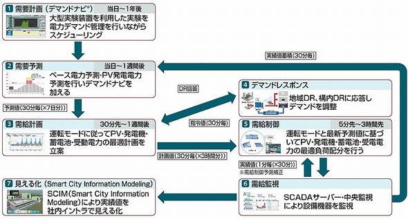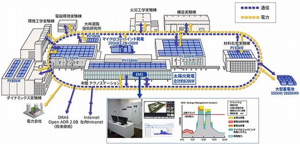 10カ所の施設のうち6カ所の屋上で太陽光発電設備が稼働している。発電能力を合計すると820kWにのぼり、メガソーラー並みの電力を供給することができる。さらに450kWのガスコンバインドサイクル発電機と500kWの大型蓄電池(容量3000kWh)を研究所内に設置して、全体を通信ネットワークで接続した「スマートエネルギーシステム」を構成する(図2)。