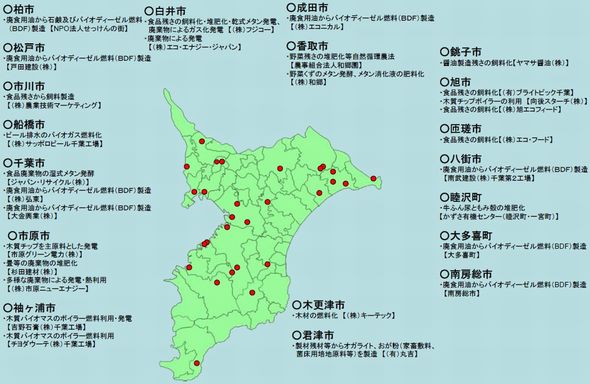千葉県内では都市部を中心に廃棄物を利用したバイオマス発電やバイオ燃料の製造も活発に広がっている(図7)。特に目を引くのは食品廃棄物からバイオガスやバイオ燃料を生成して電力や熱に転換する方法だ。多数の人口を抱える大都市圏に適したバイオマスの活用法である。