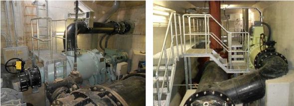 発電所がある「北船橋給水場」では、10キロほど離れた別の給水場と15キロほどの距離にある浄水場から水を受けている。この2カ所と結ぶ2本の水道管に発電機を設置した(図6)。水流の落差は28メートルと13メートルで、発電能力は2つの合計で383kWになる。年間に92万kWhの電力を供給することができる。