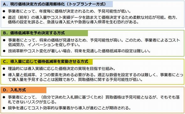 そのほかの中小水力・地熱・バイオマスの3種類に対しては、現行の価格決定方式を厳格にした「トップランナー方式」を適用する予定だ。従来の買取価格は発電設備の建設費や運転維持費の平均値をもとに決めていたが、トップランナー方式ではコスト効率の高い優良な発電設備を参考にして買取価格を決定する。