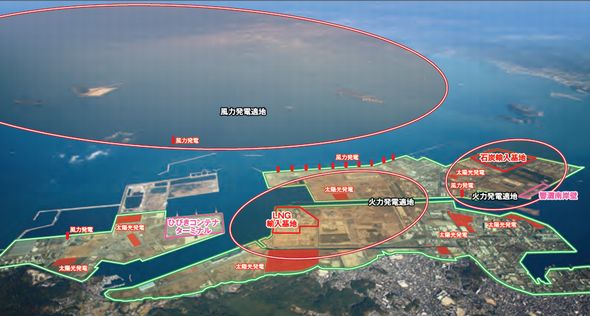 北九州市では臨海工業地帯を対象に、風力・太陽光・火力発電を集中させる「北九州市地域エネルギー拠点化推進事業」を2013年度から実施してきた(図5)。その中には洋上風力発電所を建設する計画も含まれていて、運転開始後は北九州パワーの電源に加える方針だ。