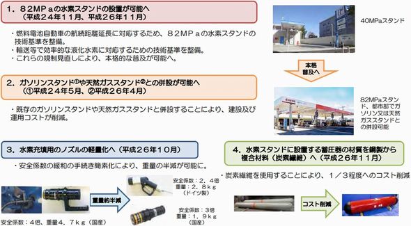 政府は燃料電池車の普及に向けて2012年から水素スタンドの規制緩和を進めてきた。高圧の水素ガスを充填できるように技術基準を改正したほか、ガソリンスタンドや天然ガススタンドと併設することも可能にした(図4)。