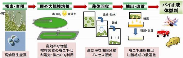 増殖した藻類を乾燥させると油脂を抽出することができて、自動車や航空機の燃料になる炭化水素油を生成することができる。石油から作った軽油に代わって、CO2を吸収する効果のあるバイオ燃料を自動車や航空機で利用できるようにする試みだ。