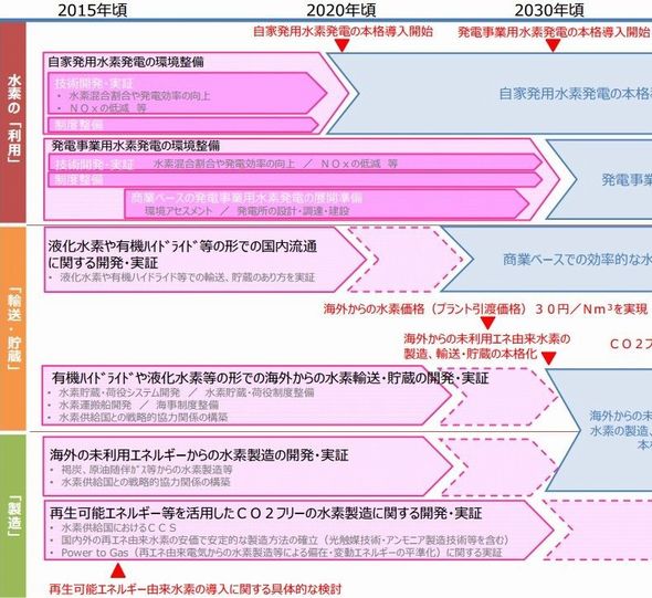 政府は再生可能エネルギーから水素を製造するための技術面と経済面の課題を具体的に洗い出すために、2016年度内に国内の主要な設備メーカーや水素供給事業者などの参加を募ってワーキンググループを立ち上げる予定だ。その中で2030年代に向けて取り組むべきテーマを設定して開発・実証フェーズへ移行する。