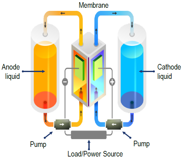 一般的なレドックスフロー電池の構成を図5に示す。中央にある四角柱が反応セル、両側にある円柱がタンクだ。負極(アノード)溶液と正極(カソード)溶液は別々のタンクに分かれている。タンク容量を増やせば蓄電システムの容量が増えることが分かる。