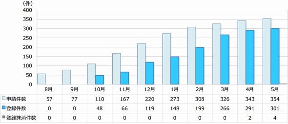 小売電気事業者の登録数は5月23日の時点で300社を超えた(図2)。すでに主要な事業者の登録はおおむね済んでいる。今後も少しずつ増加するが、合計で400社を上回ることはなさそうだ。むしろ複数の小売電気事業者による提携拡大や事業統合の動きが早くも始まるだろう。