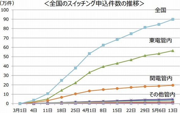 小売全面自由化から2カ月近くが経過して、市場の変化の様子が徐々に見えてきた。電力会社から他の小売電気事業者に契約変更(スイッチング)を申し込んだ件数は5月13日の時点で約90万件に達した(図1)。週あたり5万件程度の増加が続いていて、5月中に100万件を突破する見通しだ。