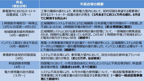 一方のシステムの不具合も本来であれば避けられたはずだが、6件のうち3件は現在も問題を解消できていない。不具合が継続中のシステムは2つある。1つは全国レベルの需要と供給を調整する役割の電力広域的運営推進機関(広域機関)の「広域機関システム」で、もう1つは東京電力の「託送業務システム」だ。