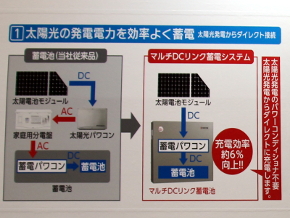 その他、蓄電池システムでは、太陽光発電による電力を直流電力(DC)のまま直接蓄電できる「DCマルチリンク蓄電池」を訴求。DC/AC変換の回数を減らすことができるために充電効率を高めることが可能となる。「自家消費時代を考えれば、効率よく蓄電池に電力をため、一度の変換で効率よく、使うということが求められる」と戸成氏は述べる(図3)。