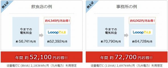 Looopが試算した飲食店の例では、契約電力が8kVA(キロボルトアンペア)で月間の使用量が2183kWhの場合に、月額の電気料金が九州電力の「従量電灯C」と比べて4349円安くなる(図5)。資源エネルギー庁が一般的な飲食店のエネルギー利用状況を分析したレポートによると、月275時間の営業時間の居酒屋(床面積366平方メートル)では月間に平均2315kWhの電力を使っている。