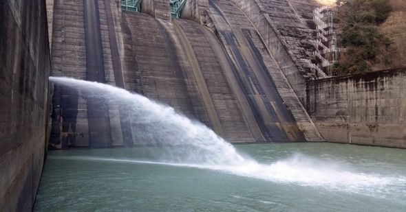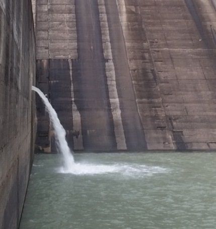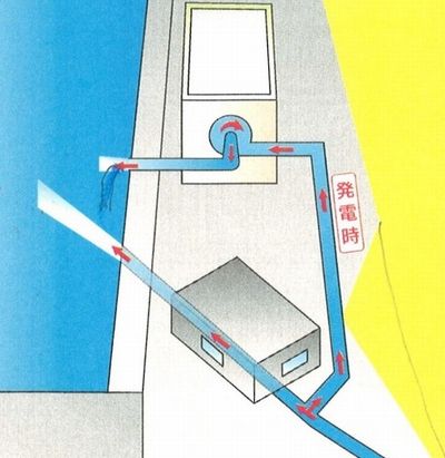 従来と比べて違う点は放流する水の勢いだ。小水力発電所を建設する以前には、ダムの壁から横向きに勢いよく水をはき出していた(図4)。発電に利用した後では水のエネルギーの多くが電力に変わるため、放流の勢いは大幅に弱まる。これまで生かすことができなかった再生可能エネルギーを有効に活用している状況が見た目にもわかる。