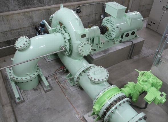 発電設備には落差の大きな水流に適した横軸フランシス水車を採用した(図3)。水力発電では最も一般的な方式で、流れ込む水が横軸を中心に垂直方向に回転して発電機を回す構造になっている。発電した後の水は従来と同様に放出するため、下流の自然環境には影響を与えない。
