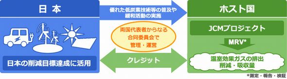 その中で第1に掲げている支援策は「二国間クレジット制度(JCM:Joint Crediting Mechanism)」を通じた低炭素技術の普及だ。日本が発展途上国を対象に、温室効果ガスの排出削減に貢献する技術やインフラを普及させるプロジェクトを実施する。その効果を定量的に評価して日本の削減目標に活用できる制度である(図3)。