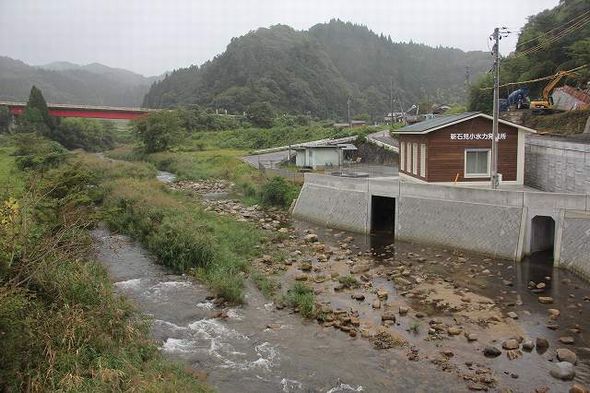 山間部の急峻な地形と豊富な川の水量を生かして小水力発電の取り組みは続いていく。ただし県が小水力発電所を稼働させた日南町では、町営の小水力発電所が事故を起こして運転を停止する問題も発生した。2015年9月に運転を開始した「新石見(しんいわみ)小水力発電所」である(図13)。
