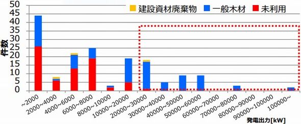 特に一般木質では出力が2万kW以上の大規模な発電設備の認定量が急速に増えてきた。現行の固定価格買取制度では、未利用木質に対して出力2000kW未満と以上で買取価格を分けている。2017年度から一般木質に対しても、出力2万kW未満と以上で買取価格を分ける方針だ。