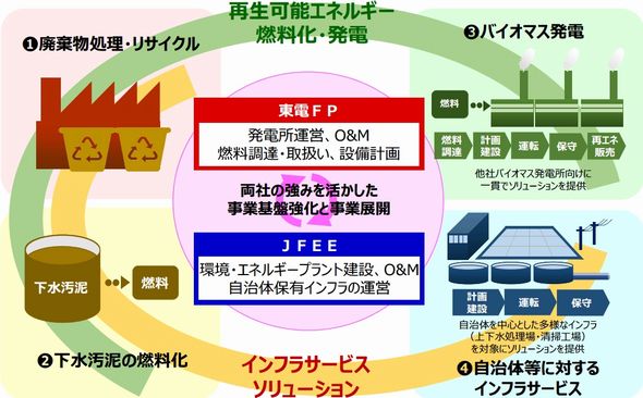 水力に続いてバイオマス発電のプロジェクトにも着手した。バイオマスの分野で実績が豊富なJFEエンジニアリングと共同で、廃棄物・下水汚泥・木質バイオマスを生かして再生可能エネルギーの燃料化・発電事業を展開していく計画だ(図8)。東京電力フュエル&パワーの燃料調達や火力発電所の運営ノウハウも活用する。
