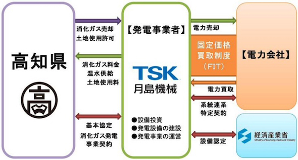 この事業は、高須浄化センター(高知市)で、下水汚泥を減量化する際に発生する消化ガスを利用して再生可能エネルギーによる固定価格買取制度(FIT)による発電事業を行うもの。高知県は、消化ガスを発電事業者に売却するとともに発電施設用地を事業者に貸与し、事業者は、事業用地に発電施設を建設して、消化ガスを利用した発電事業を行う。