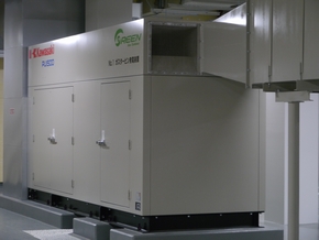 左:受変電室・UPS室に設置された分電盤やUPS(無停電電源装置) 右:発電機室に設置された重油焚きガスタービン。3基設置され、停電時には自動起動し電力を供給する。最大72時間分の燃料備蓄があるという。(クリックで拡大)この数値設定について宇佐美氏は「2018〜2019年に登場するストレージが1m2あたり2.0トンになると予測されており、これに対応するため」としており、機器を設置するラックも搭載量最大2トンのものを特注したという。