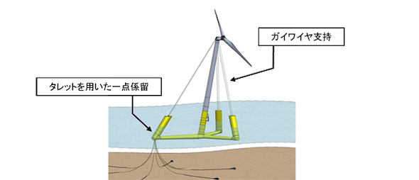 同事業では「ガイワイヤ支持」や「タレットを用いた一点係留」などの先進的な要素技術を導入することにより、発電コスト低減を目指す。「ガイワイヤ支持」は、浮体と風車タワー頂部をワイヤでつなぐことで強度・剛性を確保し、浮体・タワーを軽量化する技術。「タレットを用いた一点係留」は巨大なベアリングで構成される回転機構(タレット)により、係留システムと浮体の間を自在に回転できるよう保持し、浮体・風車を受動的に風向に合わせることで、浮体が波や潮流から受ける荷重を低減する技術だという。