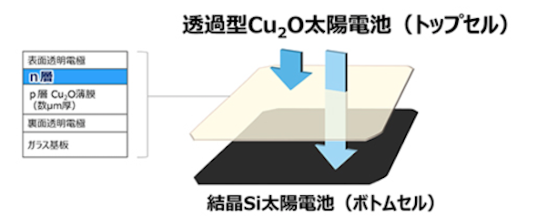 タンデム型太陽電池は、異なる性質の太陽電池(セル)をボトムセルとトップセルとして重ね合わせ、両方のセルで発電することにより、全体としての発電効率を上げる。東芝は2019年1月に、世界で初めてという地球上に豊富に存在する銅の酸化物で低コスト化が期待できる亜酸化銅(Cu2O)を用いたセルの透明化に成功した。この透過型Cu2O太陽電池をトップセルに用いたタンデム型太陽電池を合わせて開発し、Si単体での発電効率と同等の22%を達成したが、今回、効率さらに1.8%向上させ、Si単体での発電効率を上回る23.8%を達成することに成功した。