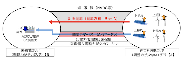 これとは逆に、エリアAの再エネ下振れに対処するための上げ調整力をエリアBから調達することは、逆方向の潮流となるため、連系線の空き容量に影響を与えない。