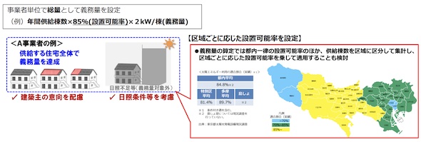 義務量は事業者の年間供給棟数に対し、設置可能率と1棟当たりの最低基準設置容量(2kW)をかけ合わせによる「総量」として算出する。義務量の算出基準となる設置可能率は東京都内一律で85%と設定する。ただし、島しょ部は対象外とする他、区域ごとに日照率などを考慮した設置可能率を設定する方針だ。