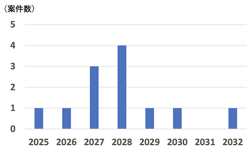 第1ラウンド公募における、3海域・全12事業者の洋上風力運転開始予定年の分布は図3の通りである。なお三菱商事エナジーソリューションズの運開時期は2028年9月、12月、2030年12月であることが公表されている。