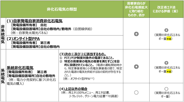 非化石電気に関しては表4のように類型化される。このうち(1)〜(3)については、高く評価すべき取り組みとして、補正係数α(>1)をインセンティブとして乗じることとする。補正係数αの具体値として事務局は、1.2〜1.5程度とすることを提案している。