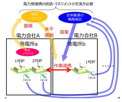 電気事業連合会では、原子力事業者間の新たな連携の方向性として、国全体最適の戦略の検討や、設備共用・共同調達、同種作業のシリーズ化を全国展開することを提案している。