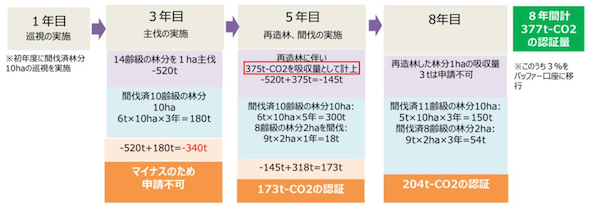 このPJでは、3年目に1haを主伐することにより520トンが排出され、この時点ではクレジットを申請できない。5年目に再造林を行うことにより、40年間の炭素蓄積量375トンを吸収量として計上する。間伐による吸収も含め、この時点で173トンのクレジット認証が可能となる。