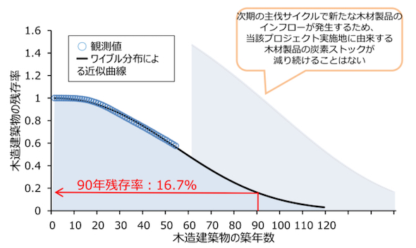 木材利用の炭素固定量をクレジット化する場合、永続性を担保する期間をどのように設定すべきかが論点となる。委員会では、国内木造建築物の残存率曲線から、永続性担保期間は90年間と設定された。
