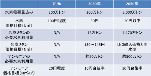 また2050年時点の水素価格目標は20円以下/Nm3であり、合成メタンではLNG輸入価格と同水準とすることが目標とされている。