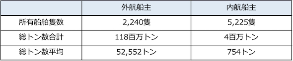 これに対して、国際海運では国別のGHG削減ではなく、国際海事機関(IMO)により、国際的な削減策が検討されている。世界全体のCO2排出量335億トンのうち、国際海運は約2.1%を占めている。同じ船舶(海運)ではあるが、外航船・内航船では著しくその規模が異なる。
