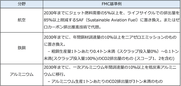 民間分野の事例として、アップルやアマゾン等のグローバル企業が低炭素・脱炭素商品の購入をコミットする「First Movers Coalition(FMC)」においては、複数の製品分野で、調達の基準にCFPの数値が設定されている。