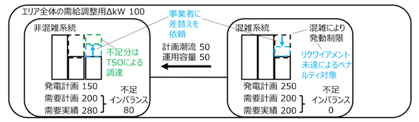 また課題2「需給調整用ΔkWの不足」に対しては、ERCOTは混雑系統の需給調整用ΔkWをリクワイアメント未達によるペナルティ対象として、事業者に差し替え依頼を通知する(図6の青色部分)。