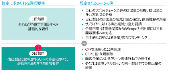 他方、直接的な製品間CFP比較を行う「タイプIII環境ラベル」などの場合には、2段階目「追加要件」が求められることとなる。