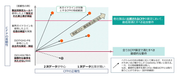 またCFPの「確からしさ(信憑性)」は、「客観性」の水準と「正確性(一次データ比率)」の水準の2軸で表される。