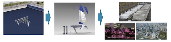 採択された事業では、まず浮体式の架台設備を利用し、海面上で太陽光発電を行う。この電力を電動船の動力源とする他、船に搭載した蓄電池に充電を行い、蓄電池の配布や公共イベントへの電力供給などによるエネルギーの地産地消を目指すという。