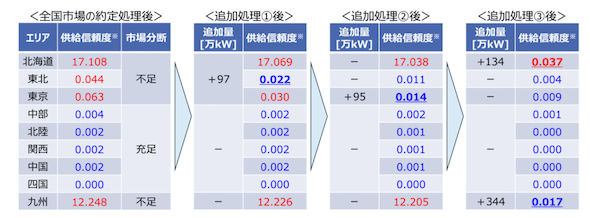 この結果、各エリアの供給信頼度は表3のようになった。なお表3の「調達量」には、事前に需要曲線に織り込む「FIT電源の期待容量」や「追加オークションで調達を予定している供給力」の合計2,427万kWが含まれている。
