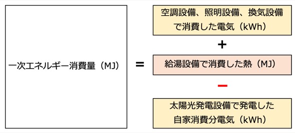 現行の建築物省エネ法においては、空調設備等による電気消費量から、太陽光自家消費分を差し引いている。いわば両者を相殺(ネッティング)するかたちとなるため、電気の一次エネルギー換算係数が問題とならない(どちらも、9.76MJ/kWhという扱い)。