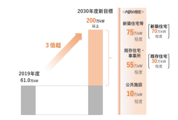 都は、建築物環境報告書制度による直接的な太陽光パネル導入量として、年間4万kW程度を見込んでいる。また、大規模建築物への設置義務化や既存建物も含む制度対象外の建物への波及効果等も通じて、2030年度には200万kW以上へ増加させることを目指している。